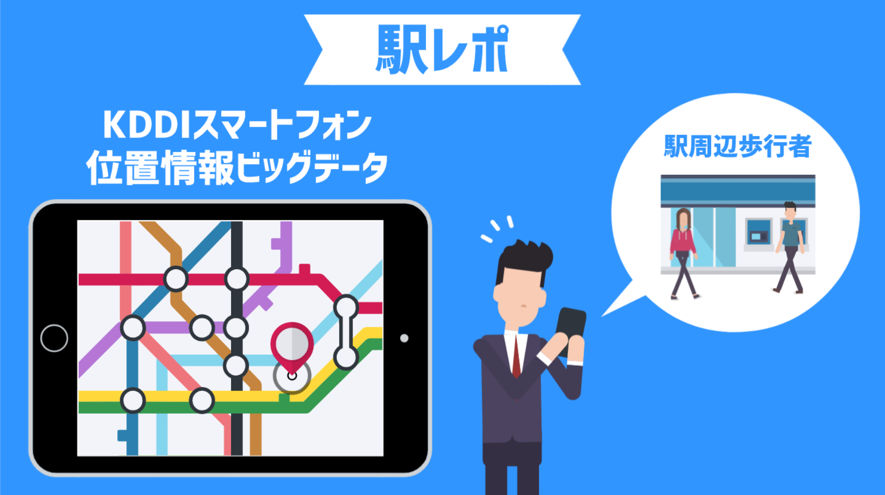 駅レポはKDDIスマートフォン位置情報ビッグデータを活用し、駅周辺歩行者の状況をレポートにしてお届けするサービスです!